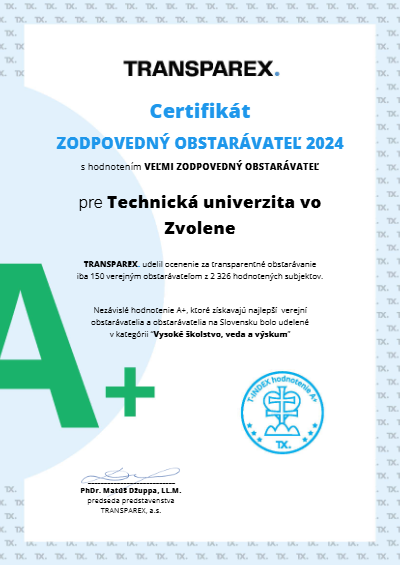 Technická univerzita vo Zvolene potvrdila dlhodobú vysokú úroveň riadenia verejných zdrojov. Portál TRANSPAREX jej za rok 2024 udelil prestížne ocenenie Zodpovedný obstarávateľ s najvyšším hodnotením A+. Univerzita tak štvrtý rok po sebe patrí do úzkej skupiny najtransparentnejších verejných obstarávateľov na Slovensku.